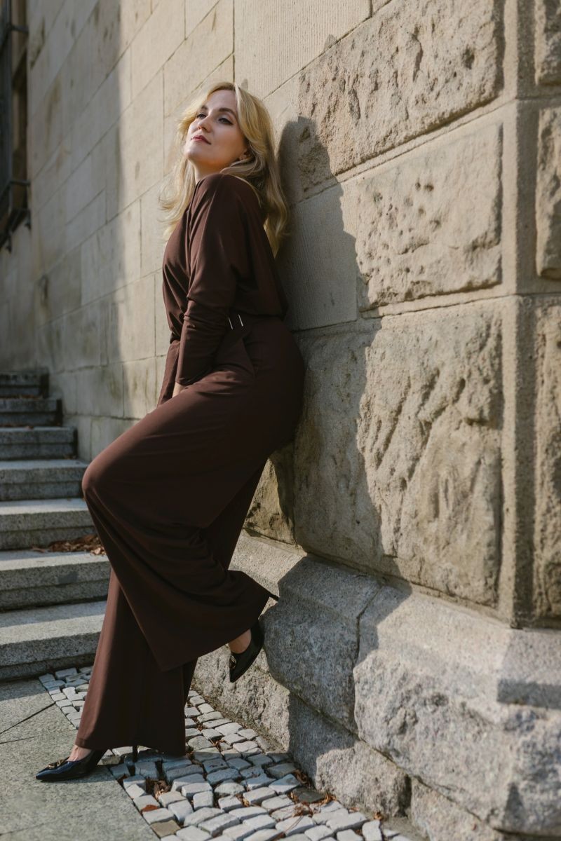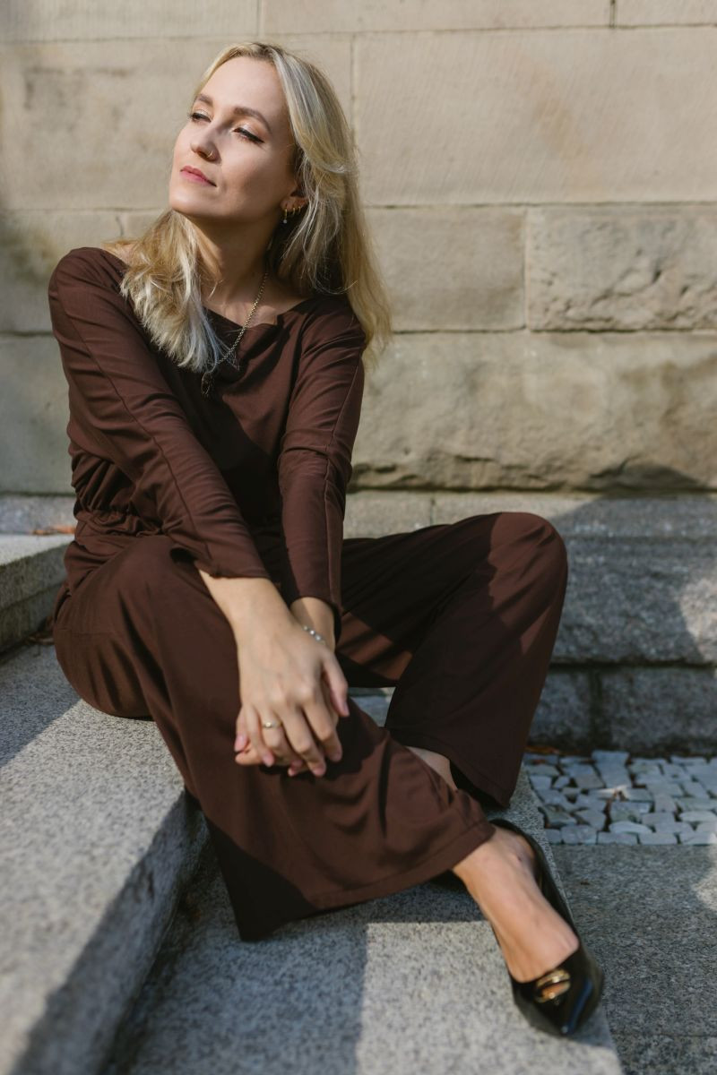 Kombinezon damski w kolorze modnej czekolady. Uszyty z elastycznego materiału, odpornego na zagniecenia. Tak zwane "masełko"....