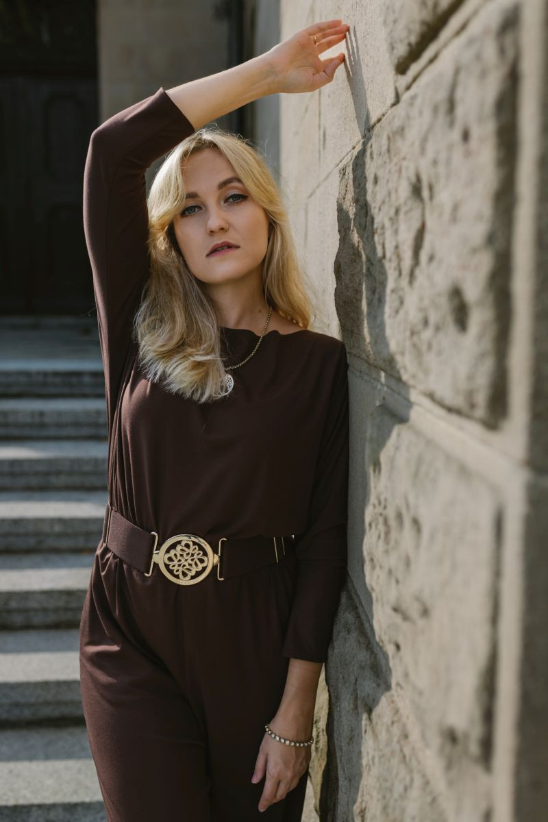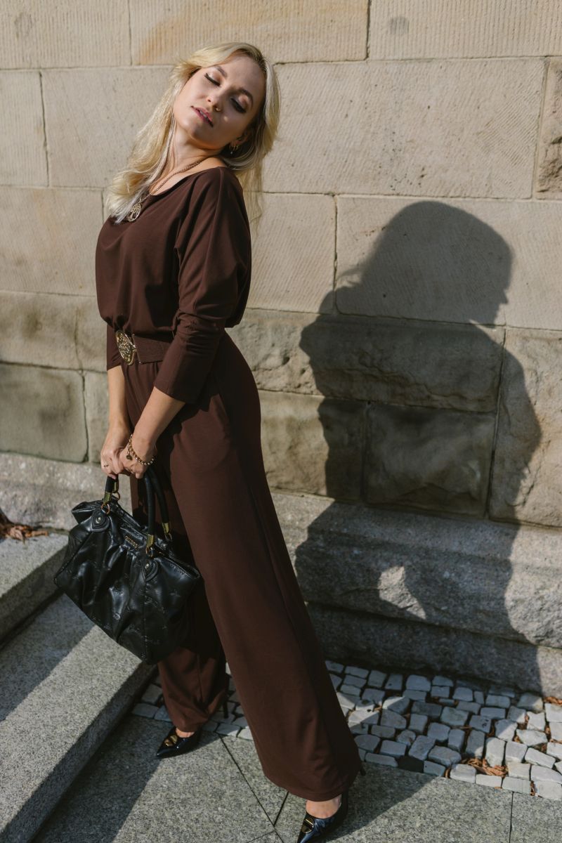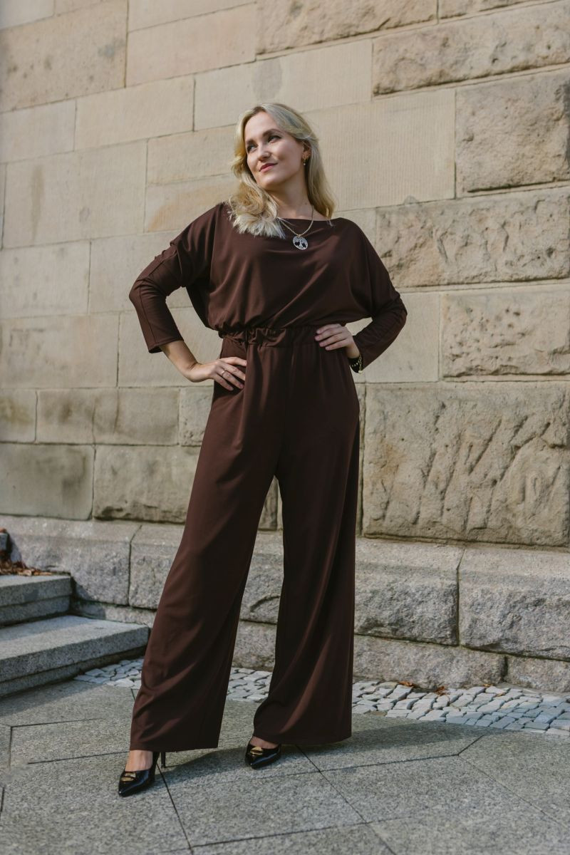 Kombinezon damski w kolorze modnej czekolady. Uszyty z elastycznego materiału, odpornego na zagniecenia. Tak zwane "masełko". Skrojone z całością kimonowe rękawy pięknie podkreślają linię ramion, a szeroka guma w pasie podkreśla talię. Rękawy długości 3/4. Ozdobny pasek nie stanowi oferty sprzedaży. Polska produkcja.